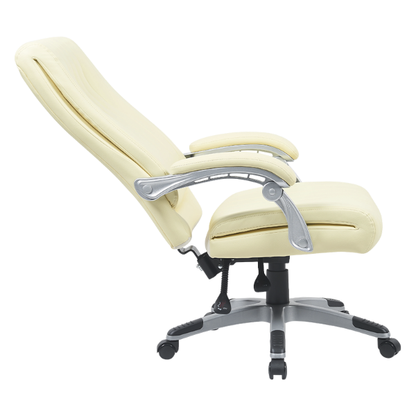 Hladké lesklé podrúčky stoličky sú lakované sofistikovaným strieborno-bielym povrchom, čo prispieva k celkovej modernej estetike a zároveň ponúka odolnú a spoľahlivú oporu pre ruky počas dlhých pracovných hodín.